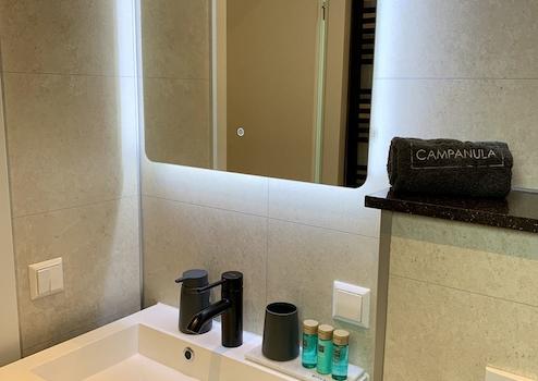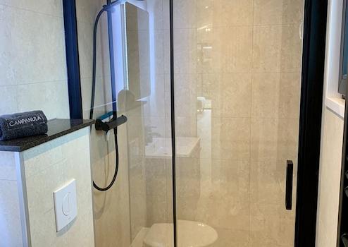 De moderne badkamer met chique uitstraling heeft een douchecabine met glazen schuifwand. Verder is er wasmeubel met verlichte spiegel en een toilet.