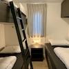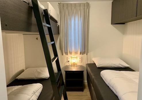 Auf der anderen Seite befindet sich ein Etagenbett, von dem das untere Bett an die Wand geklappt werden kann. Dies schafft z.B. Platz für ein Babybett oder große Koffer (bei einer Belegung mit 4 Personen).