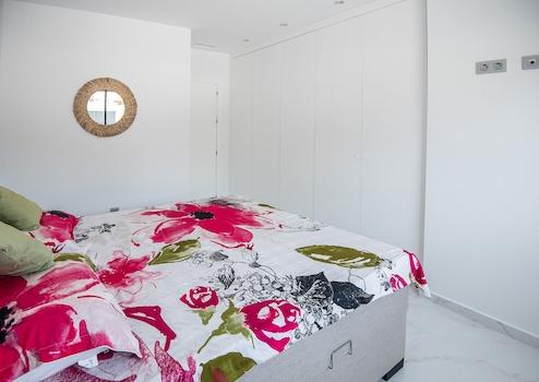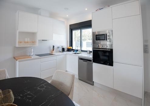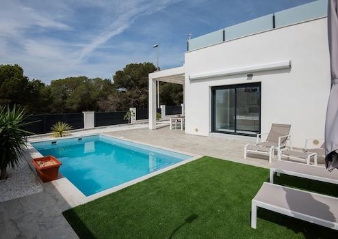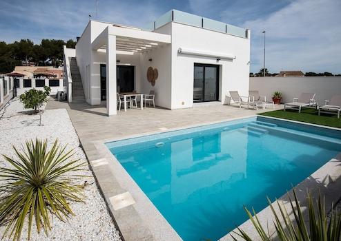 Diese exklusive Villa bietet auf einer Ebene drei Schlafzimmer, zwei Badezimmer, einen privaten Swimmingpool und einen Parkplatz auf eigenem Grundstück. Jede der nur fünf Villen dieser kleinen Anlage verfügt zudem über eine sonnige Dachterrasse, die einen herrlichen Blick auf die Umgebung bietet.