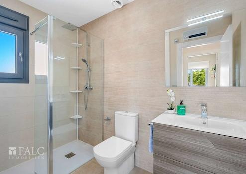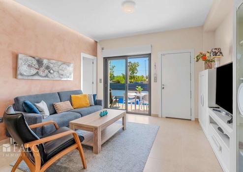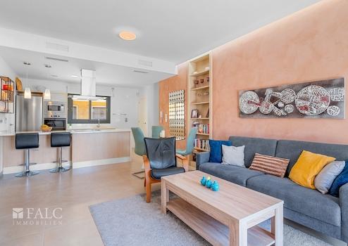 Das Haus selbst überzeugt durch seine durchdachte Raumaufteilung und moderne Architektur. Auf rund 122 m² Wohnfläche befinden sich drei großzügige Schlafzimmer – zwei davon praktischerweise im Erdgeschoss. Die Räume sind hell, freundlich und stilvoll möbliert, sodass ein sofortiger Einzug ohne weiteren Aufwand möglich ist. Das große Wohn-Esszimmer mit offener Küche lädt zu geselligen Stunden ein, während die bodentiefen Fenster einen direkten Blick auf den Außenbereich mit Pool ermöglichen.
