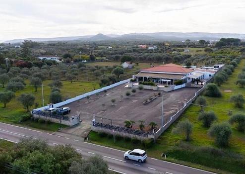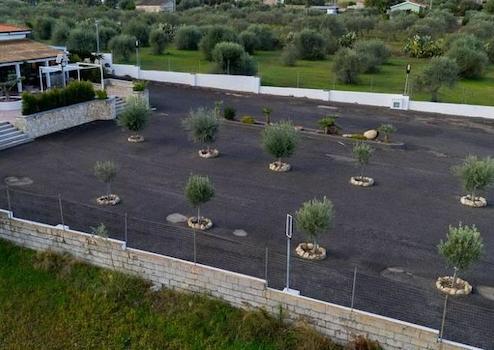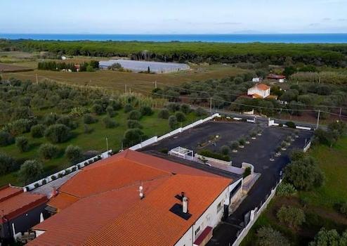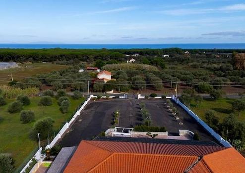 Hinter dem Hauptgebäude befindet sich ein großer, ebener und gepflegter Privatpark mit ausreichend überdachten Parkplätzen, ideal für Gruppen, Veranstaltungen und Saisongäste.