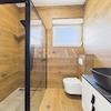 Das Erdgeschoss der Villa bietet ein offenes Wohnzimmer mit Küche und Essbereich, eine Speisekammer, ein Badezimmer, ein zusätzliches WC sowie eine voll ausgestattete finnische Sauna – ideal zur Entspannung das ganze Jahr über. Der geräumige Wohnbereich ist durch große Glaswände lichtdurchflutet, die Innen- und Außenbereich nahtlos verbinden.
