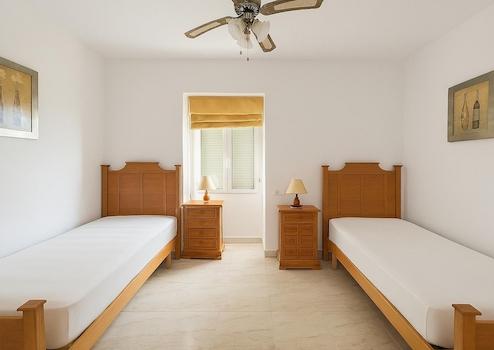 Das Hauptschlafzimmer im oberen Stock hat begehbaren Kleiderschrank und eigenes Bad. Auf der mittleren Ebene befinden sich Wohnzimmer, Essbereich, Küche, überdachter Innenhof sowie zwei Doppelzimmer mit Bad. Terrasse und Pool bieten Blick auf Golfplatz und Meer.