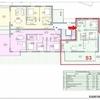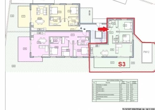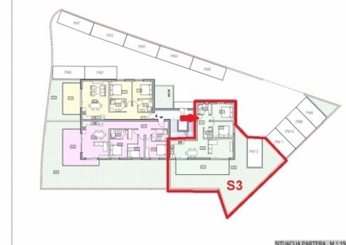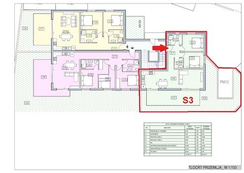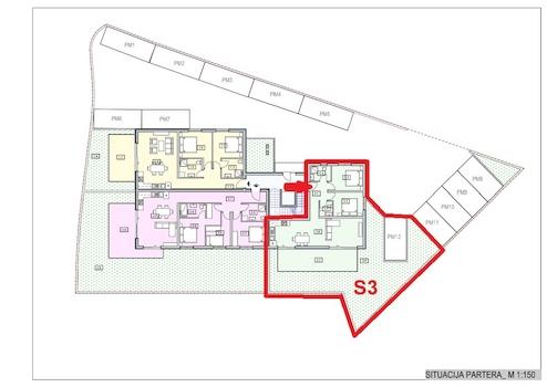 Die zum Verkauf stehende Wohnung (TS-S3) befindet sich im Erdgeschoss des Gebäudes. Sie besteht aus zwei Schlafzimmern, Flur und Eingangsbereich, Wohnküche, einem Badezimmer, einem WC, einer 23,53 m² großen Terrasse und einem 84,54 m² großen Garten. Zur Wohnung gehört ein Stellplatz. Die Gesamtfläche beträgt 187 m².