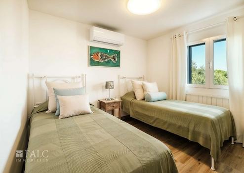 Das Haus wurde vollständig modernisiert und umfasst zwei großzügige Wohnungen, jeweils mit zwei Schlafzimmern, einem hellen Wohnzimmer, einem Badezimmer und einer Küche, die noch ganz nach eigenen Wünschen gestaltet werden kann. In den Wohnbereichen sorgen moderne Klimaanlagen für angenehme Kühle im Sommer, während ein Kamin an kühleren Tagen wohlige Wärme spendet und ein behagliches Ambiente schafft.