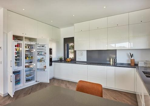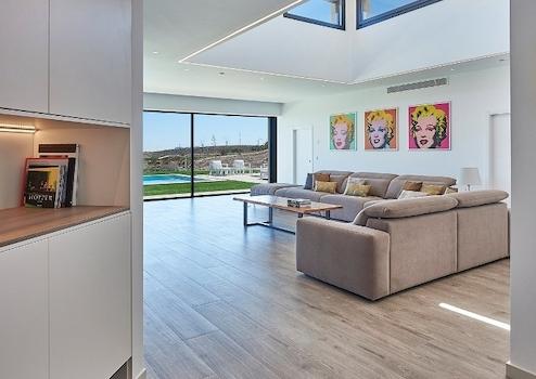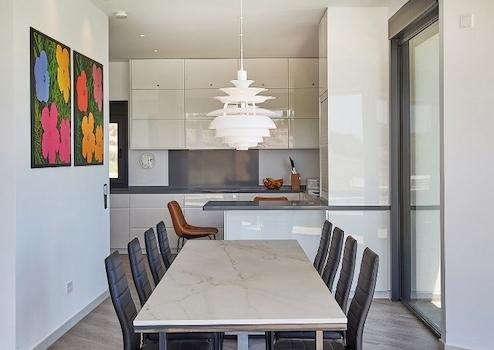 Private Auffahrt mit mediterranen Palmenrondell, direkt an der Eingangstür Ihres Luxusrefugiums. Beim Betreten der Villa schnell klar, dass sich diese Unterkunft wirklich von der Masse abhebt: Sehr großzügiger Tagesbereich mit Wohnzimmer inkl. Lichtturm, Esszimmer und modernster Einbauküche mit allem Komfort und beeindruckender Glasfront mit Land- und Meerblick auf 100 m² Wohnfläche. Imposante Panoramafront mit rahmenlosen Fenstern und atemberaubendem Blick auf den Pool, die Skyline von Alicante und das Meer, komplett in der Hauswand versenkbar. Exklusiv ausgestattete Küche mit Bar und angrenzendem Essbereich für 10 Personen. Ein raffiniert gestalteter Dachfensterturm sorgt für zusätzliches Tageslicht von oben, während ein intelligentes Klimatisierungssystem für die optimale Raumtemperatur sorgt.