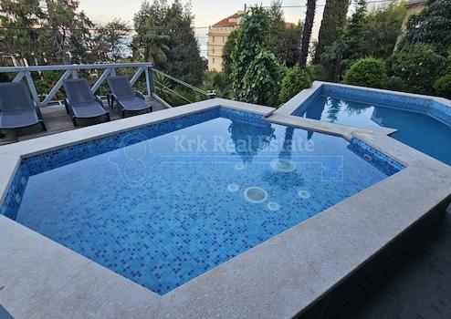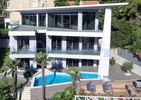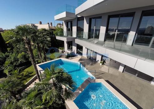 Zum Verkauf steht eine freistehende Villa von 758 m2 im Zentrum von Opatija, die auf einem 722 m2 großem Grundstück gebaut wurde, bestehend aus Keller, Erdgeschoss, ersten und zweiten Stock. Der Keller besteht aus Weinkeller mit Grill, Sauna, Fitnessraum, Maschinenraum und Garage mit zwei Parkplätzen. Das Erdgeschoss besteht aus zwei Wohnungen mit separaten Eingängen. Die erste Wohnung besteht aus Wohnzimmer, Wohnküche, Bad und zwei Schlafzimmer. Die zweite Wohnung besteht aus Wohnzimmer, Wohnküche, Bad und Schlafzimmer. Jede Wohnung hat eigenen Ausgang auf die wunderschöne Außenanlage mit Pool, Sonnendeck und Grill. Im ersten und zweiten Stock befindet sich jeweils eine Dreietagenwohnung, die mit dem Keller verbunden sind. Der erste Stock verfügt über ein geräumiges Wohnzimmer, eine Küche, ein Esszimmer, ein Bad, eine Toilette und zwei Schlafzimmer. Die zweite Etage verfügt über ein Hauptschlafzimmer, ein Ankleidezimmer, ein Badezimmer und einen Whirlpool. Jede Etage hat eine eigene Terrasse und einen schönen Blick auf das Meer, das nur 150 Meter entfernt ist.