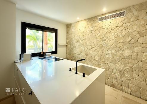 Mit einer Wohnfläche von rund 125 m², verteilt auf zwei Etagen, bietet das Anwesen ein harmonisches Zusammenspiel aus moderner Eleganz und mediterraner Leichtigkeit. Der offene Wohn- und Essbereich mit elegant integrierter Küche bildet das Herzstück des Hauses – großzügig, hell und einladend. Große Fensterfronten öffnen den Blick auf den Garten, während warme Materialien wie der charakteristische Mares-Stein und edles Eichenholzparkett eine Atmosphäre von Natürlichkeit und Stil schaffen.