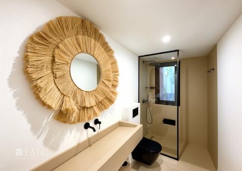 Das Obergeschoss beherbergt zwei weitere Doppelschlafzimmer, jeweils mit Bad en Suite – das Hauptschlafzimmer zusätzlich mit Badewanne – und beide mit Zugang zu privaten Sonnenterrassen. Von hier aus genießt man einen herrlichen Blick über das Meer und die umliegende Berglandschaft – je nach Tageszeit in einem immer neuen, faszinierenden Licht.