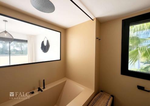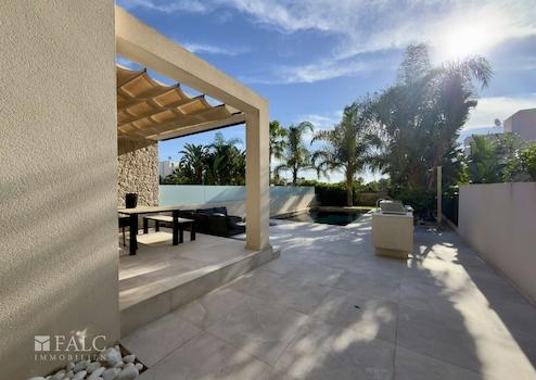 Für höchsten Komfort zu jeder Jahreszeit sorgen Fußbodenheizung und Klimaanlage. Weitere Ausstattungsmerkmale wie elektrisch gesteuerte Markisen und Sonnenschutzrollos, eine automatische Gartenbewässerung, ein elektrisches Zufahrtstor, ein separater Hauswirtschaftsraum sowie eine Wärmepumpe unterstreichen den gehobenen Anspruch dieser Immobilie.
