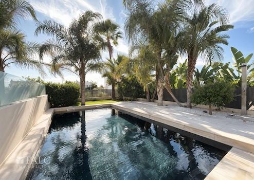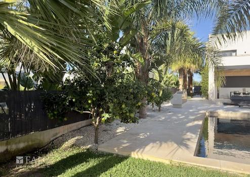 Das ca. 350 m² große Grundstück ist liebevoll gestaltet und spiegelt das mediterrane Flair bis ins Detail wider. Zwischen Palmen und Zitrusbäumen laden eine großzügige Sonnenterrasse, ein 32 m² großer Salzwasserpool, eine voll ausgestattete Außenküche und eine Außendusche zum Entspannen und Genießen ein – perfekt für Sommertage mit Familie und Freunden.