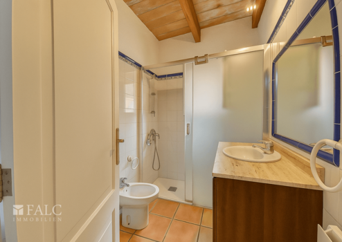 Zwei überdachte Terrassen sowie ein kleines Pool-Bad mit WC und Dusche, direkt vom Außenbereich zugänglich, laden zum Genießen unter freiem Himmel ein. Eine großzügige Dachterrasse mit Außentreppe eröffnet spektakuläre Ausblicke auf grüne Berge und die Küste – perfekt für unvergessliche Sonnenuntergänge.
