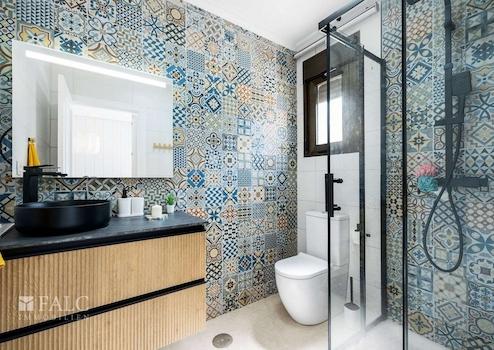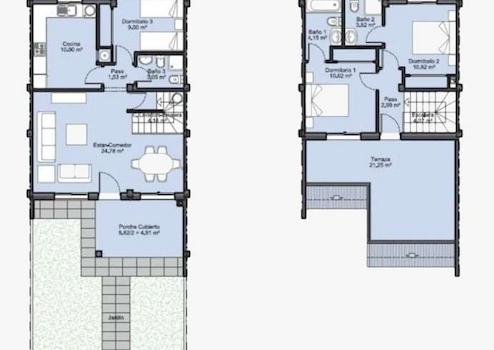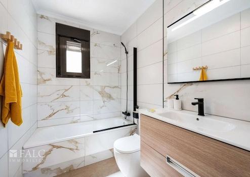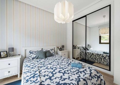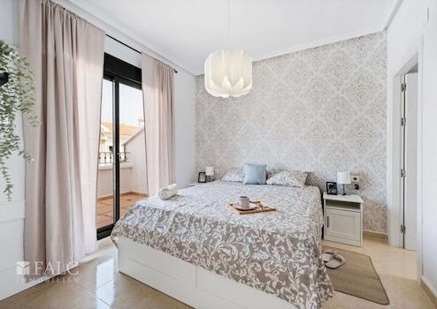 Im Obergeschoss befinden sich drei Schlafzimmer, die alle hell und freundlich gestaltet sind. Das Hauptschlafzimmer bietet Zugang zu einem weiteren Balkon, ideal für einen ruhigen Morgenkaffee. Zwei moderne Bäder sorgen für Komfort und Privatsphäre.