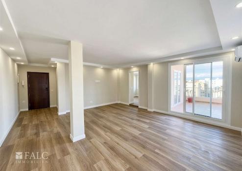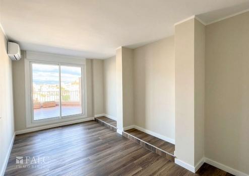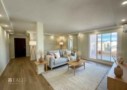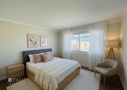 Das Apartment befindet sich im 6. Obergeschoss eines Mehrfamilienhauses, das über zwei Aufzüge verfügt und somit einen bequemen Zugang bietet. Der offen gestaltete Wohn- und Essbereich ist das Herzstück der Wohnung. Große Fensterflächen sorgen für viel Tageslicht und eine einladende Atmosphäre. Von hier aus gelangen Sie direkt auf die Terrasse – ein perfekter Ort, um die mediterranen Abende zu genießen.