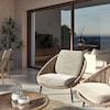 Durchgehend verlegte Porzellanfliesen im Farbton Elfenbein schaffen ein warmes, einheitliches Wohngefühl – drinnen wie draußen, wo sie in rutschfester Ausführung verlegt werden.