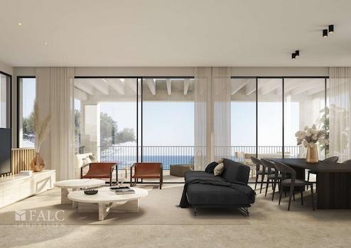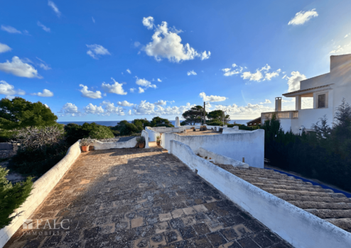 Im Obergeschoss entfaltet sich ein weitläufiger, offener Wohn- und Essbereich mit Designküche – das Herzstück des Hauses, geschaffen für lichtdurchflutetes Wohnen mit spektakulärer Aussicht. Von hier führt eine großzügige Südterrasse direkt hinaus in die Weite des Mittelmeers und eröffnet den Blick auf den ikonischen Leuchtturm von Cala Figuera.