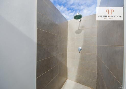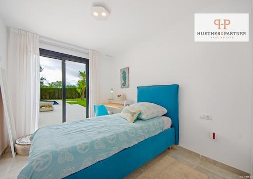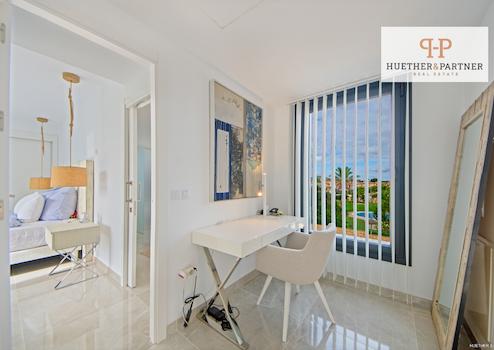Im Obergeschoss erwartet Sie ein heller Flurbereich, der ausreichend Platz für einen Arbeitsbereich bietet. Das Hauptschlafzimmer verfügt über ein en-suite Bad mit Badewanne und Außendusche sowie einen Balkon mit Blick auf Garten und Pool. Alle Schlafzimmer sind mit maßgefertigten Einbauschränken ausgestattet, die viel Stauraum bieten.