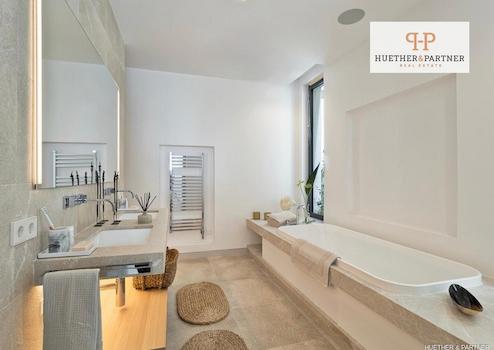 Die Villa erstreckt sich über drei Ebenen, die sowohl über ein elegantes Treppenhaus als auch einen Aufzug miteinander verbunden sind. Im Untergeschoss befindet sich eine geräumige Garage mit Platz für zwei Fahrzeuge sowie verschiedene Funktionsräume wie ein Technikraum, ein Waschraum und ein Abstellraum. Zudem gibt es hier einen großzügigen, individuell nutzbaren Raum, der sich ideal als Fitness-, Wellness- oder Kinobereich eignet.