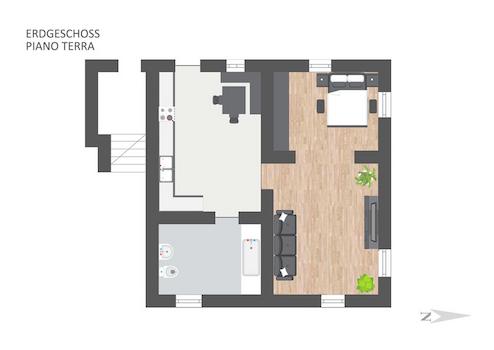 RAUMAUFTEILUNG ERDGESCHOSS: großzügige Wohnküche, 2x Elternschlafzimmer mit Terrasse und Kaminofen, Bad mit Fenster