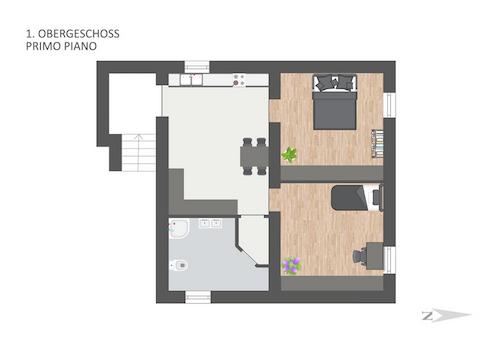 RAUMAUFTEILUNG 1. OBERGESCHOSS: großzügiger Eingangsbereich mit Wohnküche, 2x Elternschlafzimmer, Bad mit Fenster