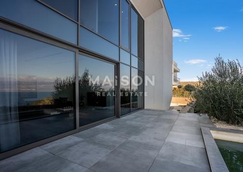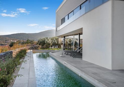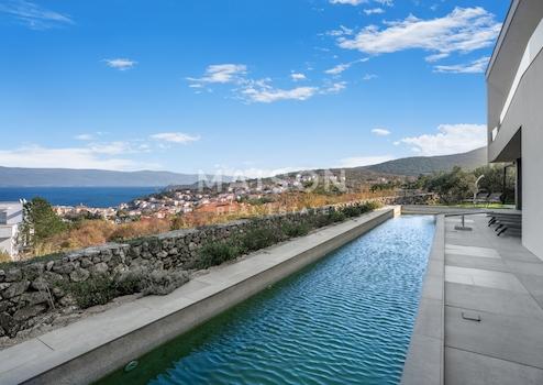 In einer der begehrtesten Lagen auf der Insel Krk befindet sich diese beeindruckende, moderne Villa mit einem unverbauten Panoramablick auf das Meer aus jedem Raum, einschließlich der Badezimmer. Großzügige Glasfronten, die sich über das gesamte Erdgeschoss und den ersten Stock erstrecken, schaffen eine perfekte Verbindung zwischen Innen- und Außenbereich und erfüllen den Raum mit natürlichem Licht und dem ständigen Blick auf das Meer.