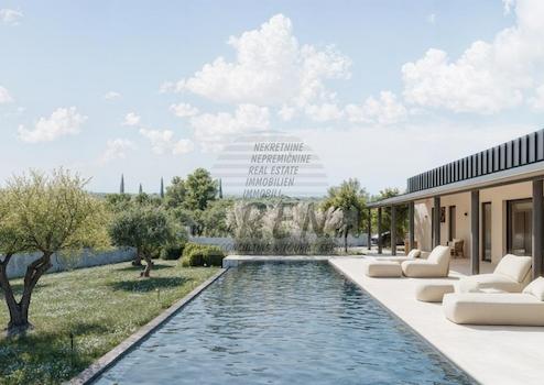Zum Verkauf steht eine außergewöhnliche moderne Erdgeschossvilla mit Swimmingpool, gelegen in einer ruhigen Gegend bei Buje, nur wenige Minuten von der slowenischen Grenze entfernt. Entworfen von einem renommierten, preisgekrönten Architekten, der für seine herausragenden Projekte in ganz Istrien bekannt ist, vereint diese Villa elegantes Design, Funktionalität und Harmonie mit der Natur.