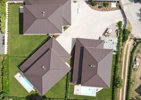Die Häuser wurden 2025 in moderner Ziegelbauweise mit Ziegeldach errichtet und verfügen über ein Erdgeschoss sowie ein vollwertiges Obergeschoss mit Wohnzimmer und vier weiteren Zimmern. Sie bieten ein privates Grundstück, eine separate Doppelgarage und diverse Komfortmerkmale wie einen Swimmingpool oder Whirlpool und einen angelegten Privatgarten.