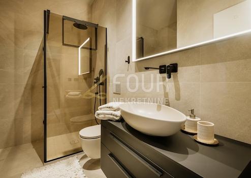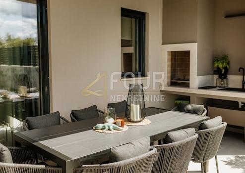 Im Angebot steht ein luxuriöses Neubau - beeindruckende moderne Doppelvilla mit einer Fläche von 130 m2, ruhig gelegen nur 800 m vom Meer entfernt, in einem wunderschönen touristischen Ort nur 7 km von Poreč entfernt. Die Villa befindet sich auf einem Grundstück von 305 m2, mit einem gepflegten Garten von 217 m2 und beheiztem Pool! Diese elegante Immobilie zeichnet sich durch außergewöhnliches Design und hochwertigen Bau aus. Im Erdgeschoss befinden sich ein Eingangsbereich, ein Badezimmer, ein Schlafzimmer und ein geräumiger offener Bereich mit Küche, Esszimmer und Wohnzimmer. Große Glasfronten sorgen für viel Tageslicht und direkten Zugang zur Terrasse mit beheiztem Pool von 26 m2, Sonnendeck, Außenkamin und Bereichen zum Entspannen. Im Obergeschoss befinden sich zwei komfortable Schlafzimmer, jedes mit eigenem Bad und einer gemeinsamen Terrasse mit Meerblick. Die Villa wird komplett möbliert und ausgestattet verkauft, mit hochwertigen Materialien und Details: Fußbodenheizung mit Wärmepumpe, Aluminiumfenstern, elektrischen Rollläden, Jalousien, 20 cm dicke Wärmedämmfassade und Überwachungs-, Alarmanlagen und Einbruchsschutz. Zusätzlicher Wert wird durch den Innen- und Außenkamin, Grill und zwei Parkplätze mit elektrischer Fahrzeugladestation geboten. Diese Immobilie bietet die perfekte Mischung aus modernem Luxus, Funktionalität und ruhiger Lage in Strandnähe - ideal zum Leben oder als touristische Investition! Sehr geehrte Kunden, die Agenturgebühr wird gemäß den allgemeinen Geschäftsbedingungen erhoben.