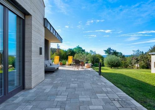 Wunderschöne Holzvertäfelungen, Holztüren und Holzfenster verleihen dem Interieur Eleganz. Die Terrasse ist mit Kalkstein und Granit belegt und bietet auf 70 m² viel Platz zum Entspannen.
