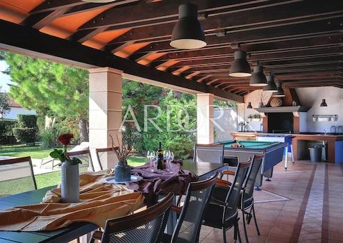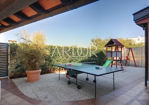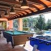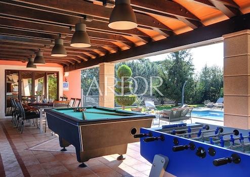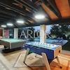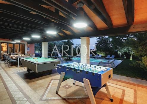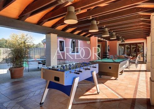 Der Außenbereich bietet einen großzügigen Garten mit Swimmingpool und Kinderspielplatz. Auf der überdachten Terrasse befinden sich eine Außenküche und ein Grillplatz. Zur Unterhaltung gibt es Billard, Tischfußball, Tischtennis und Darts – perfekt für gemütliche Abende mit Familie und Freunden.