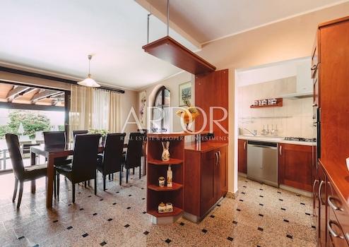 Im Erdgeschoss befinden sich ein heller Wohnbereich mit Blick auf die Terrasse und den Garten mit Pool, eine große Küche mit Essbereich, ein Schlafzimmer, ein Gäste-WC mit Waschmaschine und ein geräumiges Badezimmer mit großer Dusche.