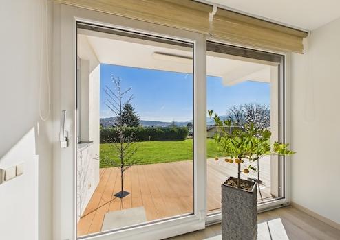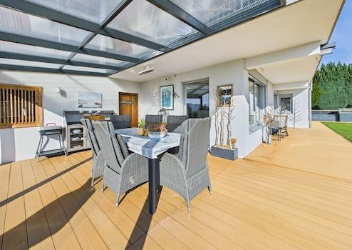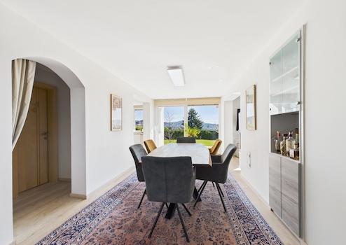 Im Untergeschoss entfaltet sich der eigentliche Wohncharakter dieses Hauses: ein Essbereich mit herrlichem Fernblick und direktem Zugang zur Terrasse, eine offen angeschlossene Küche, die sich durch hochwertige Ausstattung und perfekte Raumanordnung auszeichnet, sowie ein offenes, ineinanderfließendes Wohnkonzept, das Wohnzimmer und Wohnraum elegant miteinander verbindet. Auch hier besteht der Zugang zu einer weiteren Terrasse, die mit Milchglas überdacht und mit verschattbaren Rollos ausgestattet ist – ein geschützter Bereich, der sich ideal zum Grillen, Entspannen oder für gesellige Abende eignet.