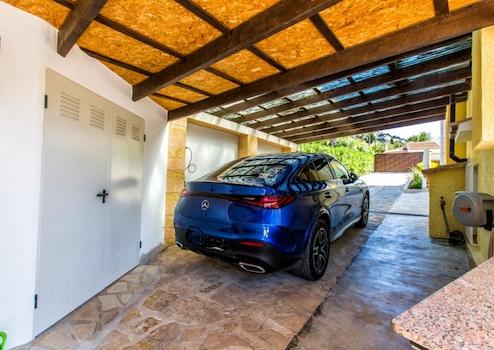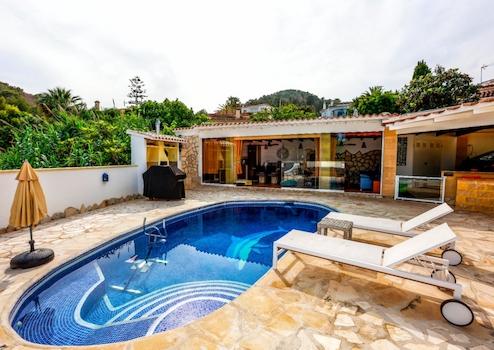 Im Außenbereich gibt es viel Platz, um das mediterrane Leben zu genießen. Eine Treppe führt von der Veranda zur Poolterrasse mit einer großen überdachten Sommerküche und einer gemütlichen Lounge-Ecke. Dank der Glasschiebetüren kann dieser Bereich das ganze Jahr über genutzt werden. Der Pool wurde 2023 renoviert, beheizt und mit einer verschließbaren Abdeckung versehen. Außerdem gibt es eine Außendusche.
