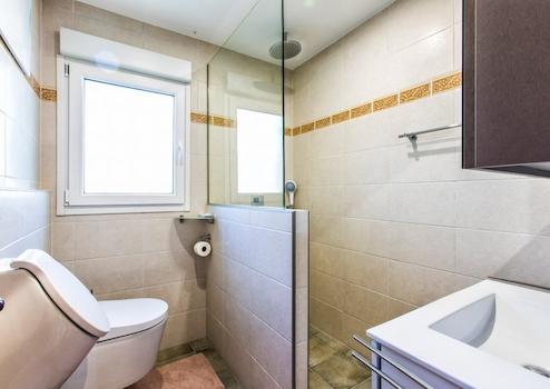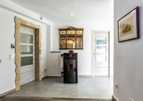 Im Obergeschoss befinden sich das Wohn-Esszimmer, eine separate, voll ausgestattete Küche und eine mit Glasvorhängen abgeschlossene Veranda. Diese Veranda bietet einen Blick auf die grüne Umgebung und ist mit einer offenen Terrasse verbunden. Ein perfekter Ort, um sowohl im Winter als auch im Sommer zu verweilen. Außerdem gibt es auf dieser Etage ein großes Schlafzimmer mit eigenem Bad, ein zweites Schlafzimmer (derzeit als Büro genutzt) mit eigenem Bad und ein separates Badezimmer. Für ein angenehmes Raumklima sorgen eine Klimaanlage (warm/kalt), Pelletöfen auf beiden Etagen, Doppelverglasung und elektrische Rollläden.