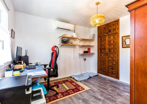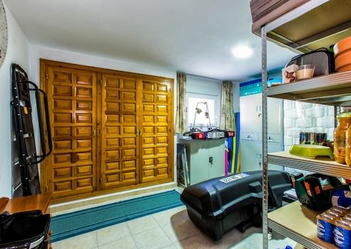 Über eine interne Treppe gelangen Sie in das Erdgeschoss. Hier befinden sich drei weitere Schlafzimmer, von denen zwei derzeit als Abstellraum und Büro/Fitnessraum genutzt werden. Darüber hinaus gibt es ein voll ausgestattetes Badezimmer, eine separate Toilette, eine Waschküche und zusätzlichen Stauraum.