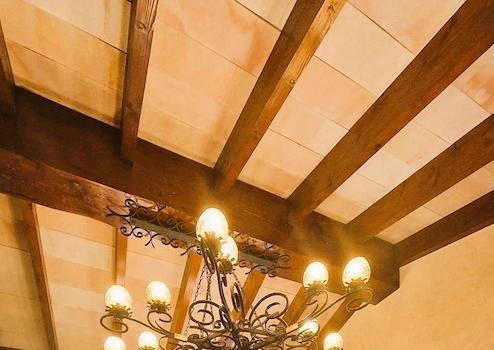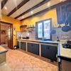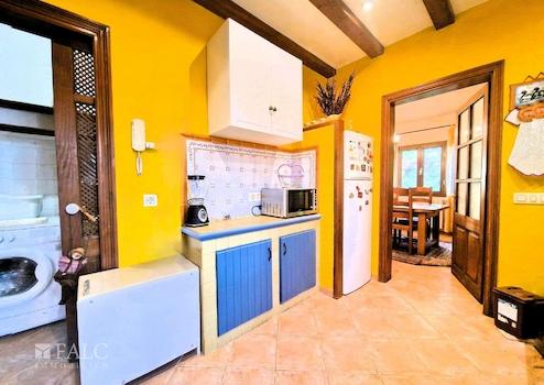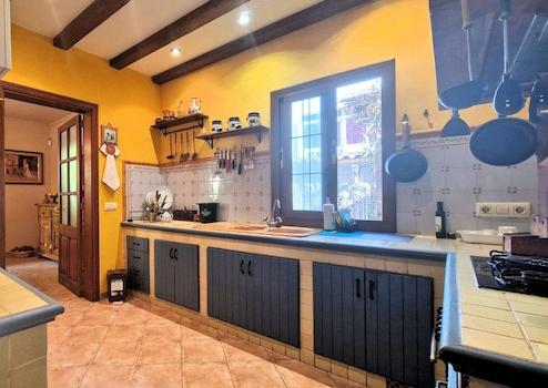 Der große Küchenbereich ist im mallorquinischen Stil gehalten – mit massiven Holzoberflächen, traditionellen Fliesen, einer geräumigen Kochinsel und integriertem Essplatz. Rustikale Deckenbalken und Natursteinakzente harmonieren mit modernen Geräten.