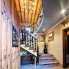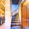 Der Eingangsbereich öffnet sich durch eine schwere Holztür und empfängt mit hellen Naturmaterialien, Holzbalken und einer offenen, luftigen Raumwirkung.