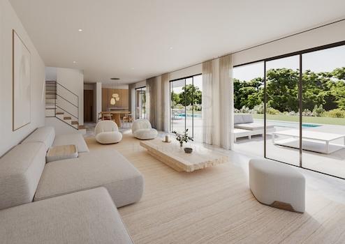 Die Villa erstreckt sich über zwei Etagen und bietet mit ihren drei Schlafzimmern und drei Badezimmern ein durchdachtes Wohnkonzept, das Komfort, Funktionalität und modernes Design vereint. Große Fenster sorgen für reichlich Tageslicht und verbinden die Innenräume harmonisch mit den Außenbereichen. Wohn- und Esszimmer eröffnen direkten Zugang zu den Terrassen, darunter auch eine überdachte Terrasse, die das mediterrane Leben im Freien zu jeder Jahreszeit ermöglicht.