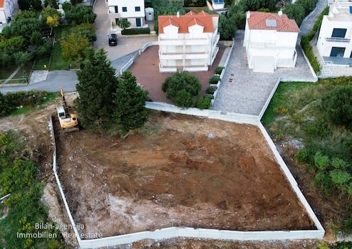 Das Grundstück ist eingeebnet und gärtnerisch gestaltet. Es ist mit einer Betonmauer umzäunt.