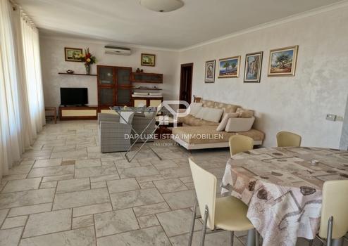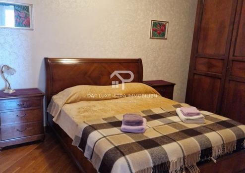 Im ersten Stock befindet sich eine weitere Wohnung mit zwei Schlafzimmern, einem Arbeitszimmer, Bad, WC, Küche, Essbereich und Wohnzimmer mit Zugang zu einem großen Balkon. Vom Balkon genießen Sie einen atemberaubenden Blick auf das Meer und die historische Altstadt von Umag mit ihrem Glockenturm, während die hintere Terrasse eine private Oase mit Gartenblick bietet.
