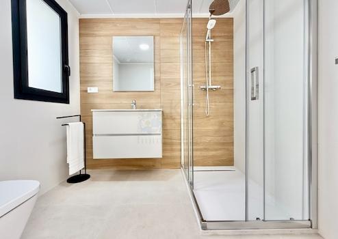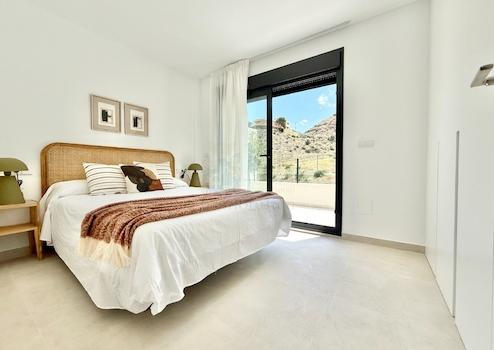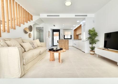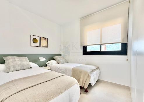 Modernes Neubau-Reihenhaus mit zwei Etagen und großzügiger Dachterrasse (32 m²) inklusive Sommerküche. Zwei komfortable Schlafzimmer, beide mit elektrischen Jalousien, sowie zwei stilvolle Badezimmer. Die vollausgestattete Küche bietet hochwertige Geräte wie Backofen, Cerankochfeld, Dunstabzugshaube, Geschirrspüler, Waschmaschine und einen Aerothermik-Boiler, abgerundet durch eine elegante Silestone-Arbeitsplatte. Vorinstallation für Klimaanlage und Photovoltaik ist bereits vorhanden. Das Haus verfügt über eine kleine Terrasse vor dem Eingang, einen Stellplatz auf dem Grundstück sowie Zugang zu einer gepflegten Gemeinschaftsanlage mit Pool.