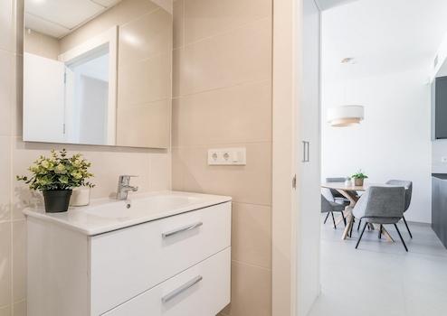 Dieses moderne Apartment verfügt über eine großzügige Terrasse, zwei Schlafzimmer, zwei Badezimmer sowie praktische Einbauschränke. Ein privater Parkplatz innerhalb der Anlage und der Zugang zum weitläufigen Gemeinschaftspoolbereich runden das komfortable Wohnangebot ab.