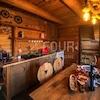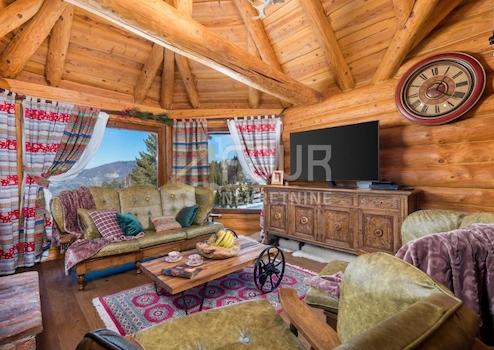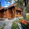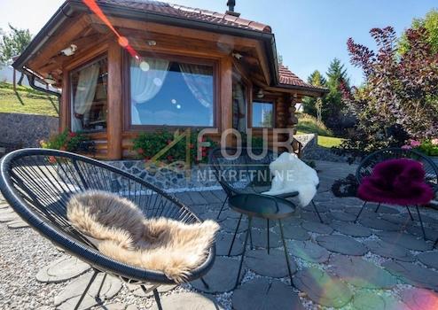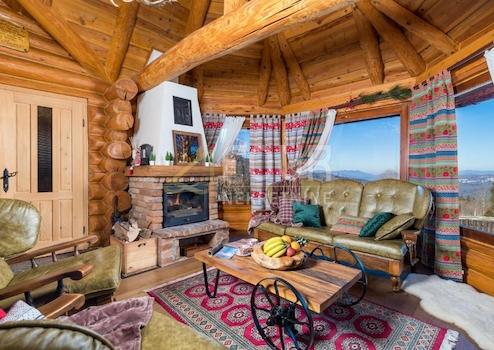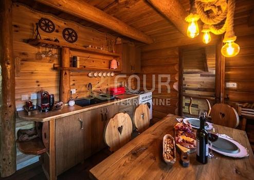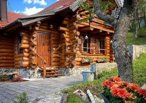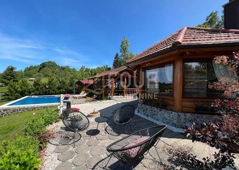 Das Anwesen hat eine Gesamtfläche von 1.554 m2 und umfasst eine romantische Blockhütte, beheizten Pool, überdachte Terrasse mit Kamin, ein A-Häuschen für Wellness-Einrichtungen.
