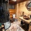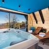 Im Erdgeschoss befinden sich ein Jacuzzi und eine Terrasse, während im Obergeschoss eine Sauna mit Blick auf die Alpen und ein Raum zum Entspannen untergebracht sind.