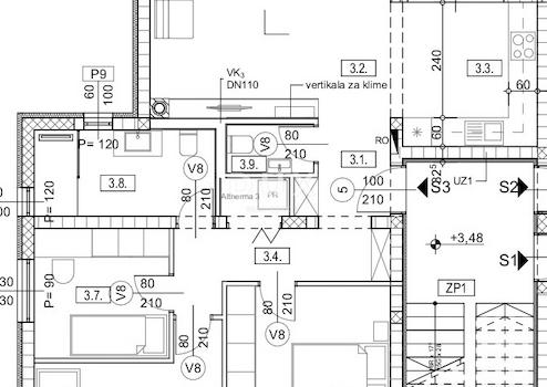 In der ruhigen Straße Marinića (Viškovo) befindet sich eine geräumige Wohnung im ersten Stock eines Neubaus, ideal für Familien. Die Wohnung bietet eine Bruttogeschossfläche von 100,47 m², davon 87,8 m² Wohnfläche und einen 3,2 m² großen Abstellraum. Zusätzlich gehören drei Parkplätze mit einer Gesamtfläche von 37,5 m² zur Wohnung.