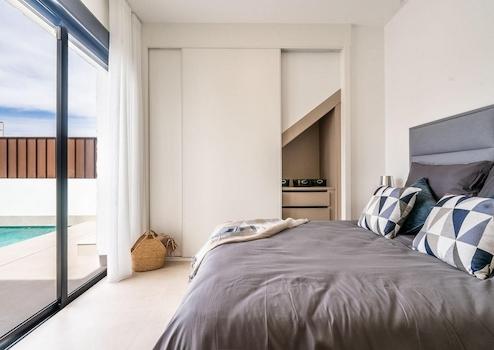 Diese moderne Neubau-Villa vereint elegantes Design mit höchstem Wohnkomfort und mediterranem Lebensgefühl. Sie verfügt über drei großzügige Schlafzimmer und zwei stilvoll ausgestattete Badezimmer, während hochwertige Einbauschränke in den Schlafzimmern für Ordnung und Funktionalität sorgen. Ein privates Solarium lädt zu entspannten Sonnenstunden ein, und das vollständig umzäunte Grundstück garantiert Privatsphäre sowie Sicherheit. Der private Swimmingpool und der Stellplatz auf eigenem Grundstück runden das exklusive Angebot ab.