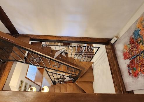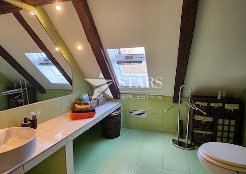 Im Erdgeschoss des Hauses befinden sich ein Wohnzimmer, ein Esszimmer und eine Küche mit Zugang zur Terrasse, eine Eingangshalle, ein Schlafzimmer und ein geräumiges Badezimmer mit Dusche, Sauna und Hydromassage-Badewanne. Im hohen Dachgeschoss befinden sich zwei große Schlafzimmer mit Seiten- und Dachfenstern und ein Badezimmer mit Dusche.