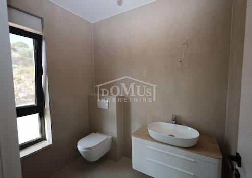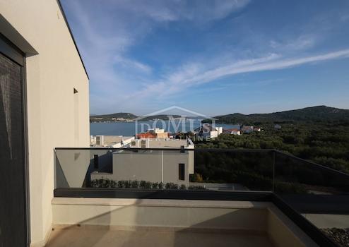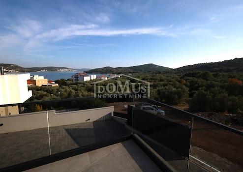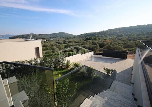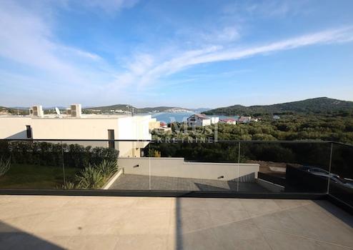 Betina, moderne Villa mit funktionalem Grundriss und wunderschönem Meerblick. Die Villa erstreckt sich über drei Etagen und verfügt über eine gesamte Nutzfläche von 218,53 m² auf einem Grundstück von 648 m². Das Untergeschoss besteht aus einer großzügigen Garage, einem Abstellraum und einer Waschküche. Eine Innentreppe führt ins Erdgeschoss, das aus einer Küche, einem Esszimmer und einem Wohnzimmer mit Ausgang zur Sonnenterrasse und zum 28 m² großen Pool besteht, sowie aus zwei Schlafzimmern – beide mit Zugang zu einer unüberdachten Terrasse – einem Badezimmer und einem WC. Im ersten Stock befinden sich zwei Schlafzimmer: eines mit eigenem Badezimmer, das andere mit eigener Garderobe, sowie ein weiteres separates Badezimmer. Die Villa ist mit hochwertigen Materialien, Keramik und Sanitäranlagen ausgestattet, klimatisiert und verfügt über eine Wärmepumpe für die Fußbodenheizung. Der Hof ist eingezäunt und gepflastert, es gibt Außenparkplätze, und ein Teil des Hofes ist mit mediterranen Pflanzen gestaltet.