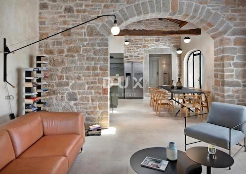 Bei Bau und Sanierung wurden ausschließlich natürliche Materialien verwendet, die ein Gefühl von Wärme, Behaglichkeit und Luxus vermitteln. Die originalen Steinplatten wurden erhalten, speziell bearbeitet und für den Innenausbau angepasst. Die Böden in den Räumen sind mit bis zu 4 Meter langen Dielen aus slawonischer Eiche belegt. Das Haus ist mit hochwertigen Möbeln und Geräten, einer Daikin Altherma Wärmepumpe, Gebläsekonvektoren, einer Fußbodenheizung für alle Steinböden und Heizkörpern in Räumen mit Holzböden, einer Alarmanlage und Videoüberwachung ausgestattet.