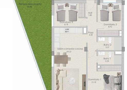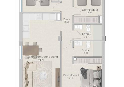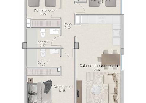 Die Wohneinheiten verfügen unter anderem über Aluminiumfenster mit Doppelverglasung, Einbauschränke in den Schlafzimmern, Einbauküchen mit Dunstabzugshaube, Sicherheitstüren, Vorinstallation einer Klimaanlage und Warmwasserbereitung über ein aerothermisches System. Zu jeder Wohnung gehört außerdem ein Kfz-Stellplatz innerhalb der Anlage und es gibt selbstverständlich Personenaufzüge in den Gebäuden.